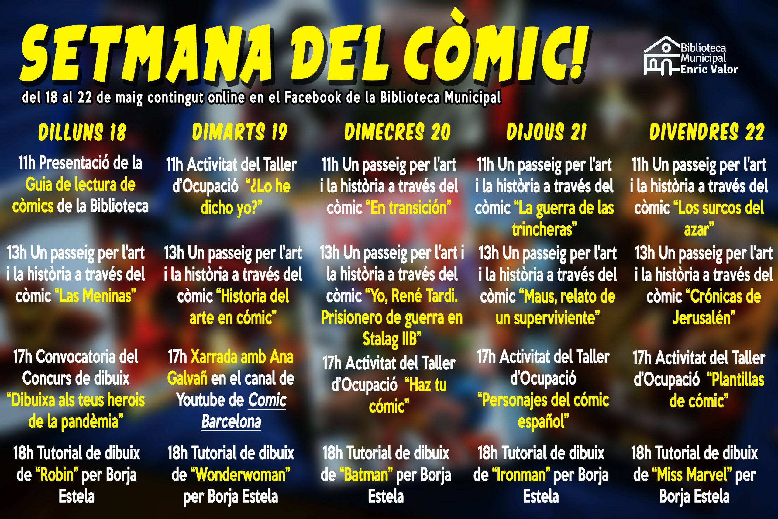 Del 18 al 22 de maig els interessats en el món del còmic podran accedir a tot el contingut en el Facebook de la Biblioteca Municipal. Les activitats programades per a aquesta setmana són les següents: