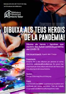 “Dibuixa als teus herois de la pandèmia” se trata de un concurso en el que se invita a toda persona interesada, mayor de 13 años, a dibujar a su héroe de la pandemia, a modo de homenaje a los profesionales que nos protegen. Los autores deberán acompañar su dibujo con el nombre del héroe y una breve descripción de su historia. Entre todas las propuestas presentadas se seleccionará al premiado que será reconocido con un diploma y una tablet. El plazo finaliza el 30 de junio y el premio será una tablet.