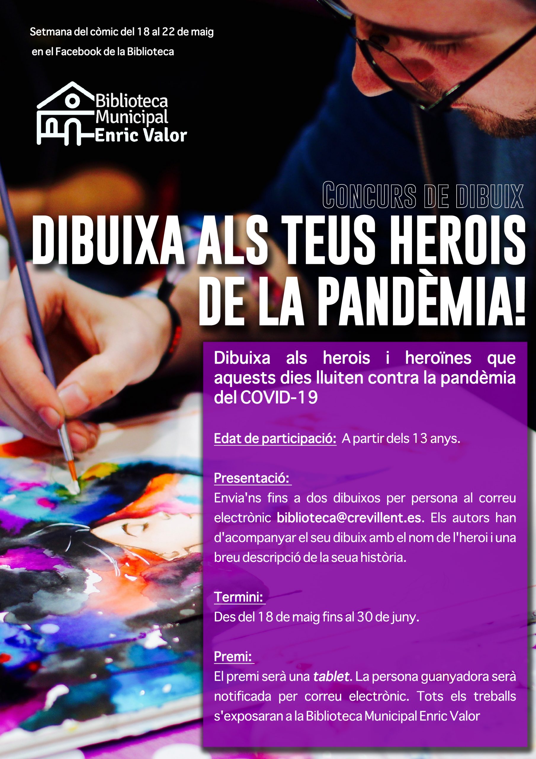 “Dibuixa als teus herois de la pandèmia” es tracta d’un concurs en el qual es convida a tota persona interessada, major de 13 anys, a dibuixar al seu heroi de la pandèmia, com una manera d’homenatgear als professionals que ens protegeixen. Els autors hauran d’acompanyar el seu dibuix amb el nom de l’heroi i una breu descripció de la seua història. Entre totes les propostes presentades se seleccionarà al premiat que serà reconegut amb un diploma i una tauleta. El termini finalitza el 30 de juny i el premi serà una tablet.