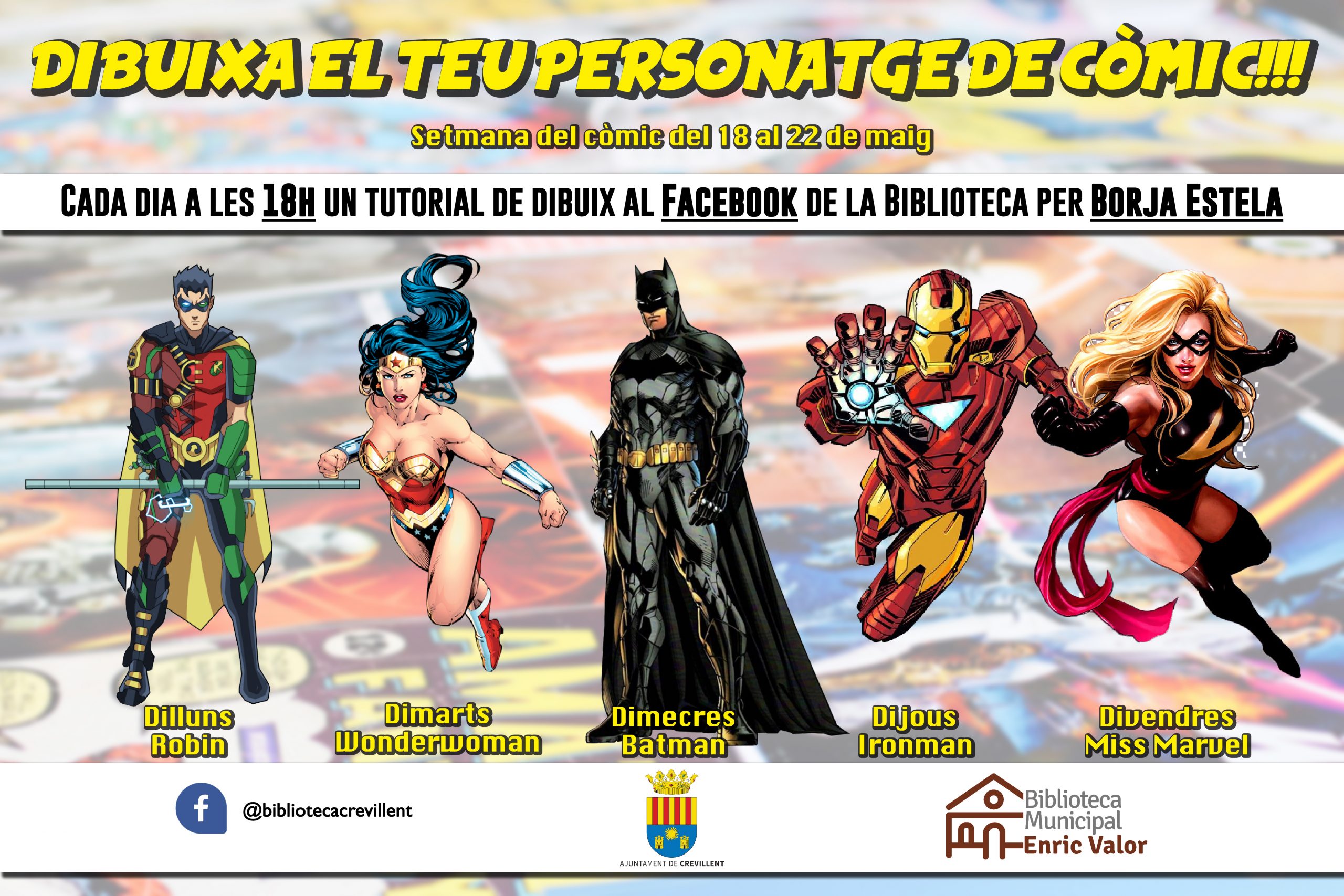 Cada dia a les 18 hores es podrà disfrutar d’uns tutorials en els quals s’ensenya a dibuixar els diferents personatges de Marvel i DC Còmics com són Robin, Wonderwoman, Batman, Ironman i Miss Marvel. Aquests tutorials han sigut adquirits per la  Regidoria de Cultura al professor de dibuix Fco. Borja Estela Prieto i formaran part del canal de Youtube de Cultura de l’Ajuntament de Crevillent.