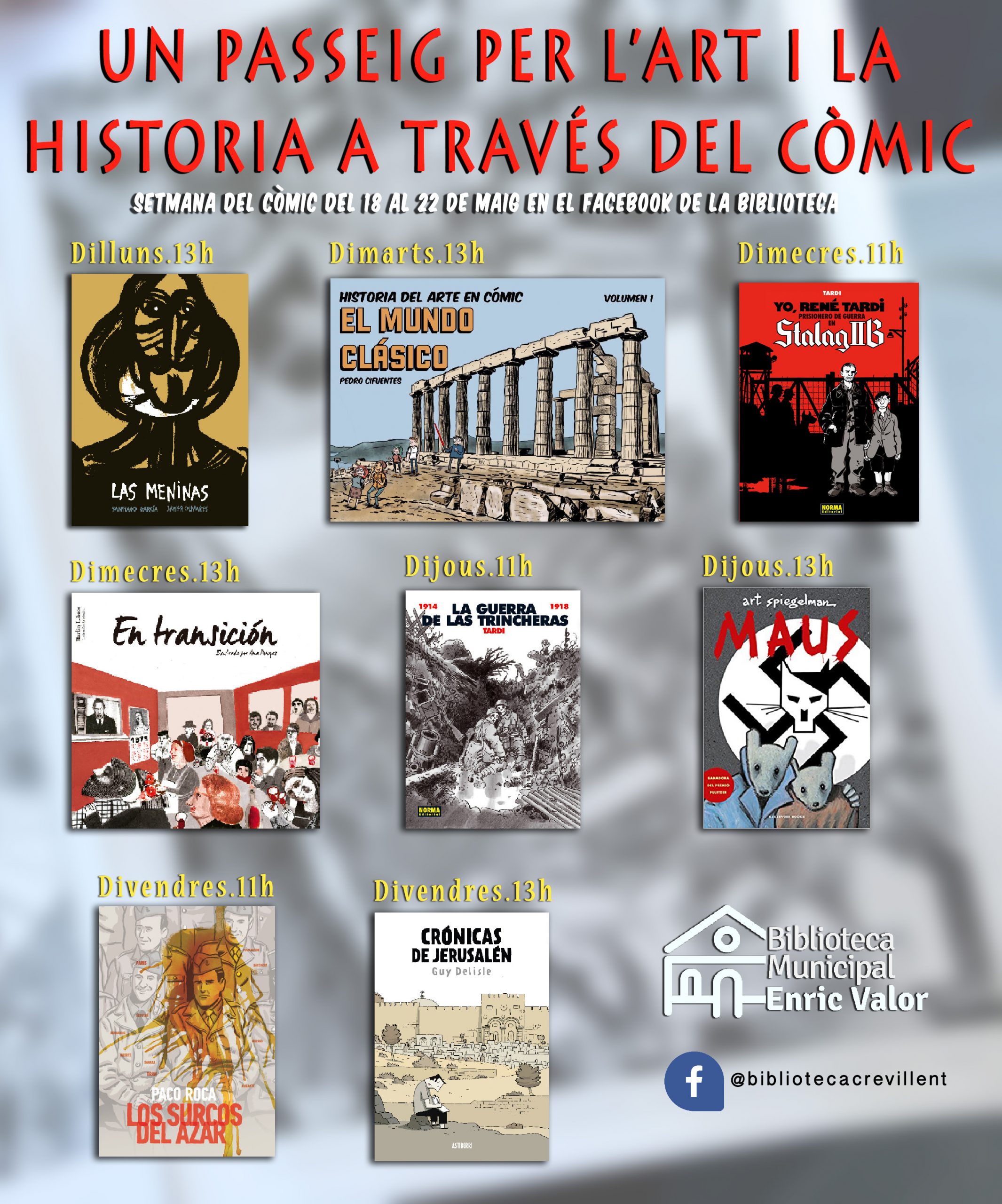 Cada dia en el Facebook de la Biblioteca es presentarà un còmic relacionat amb l’art i la història, a través dels quals podrem conéixer diferents episodis de la història. Els còmics seleccionats són: