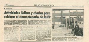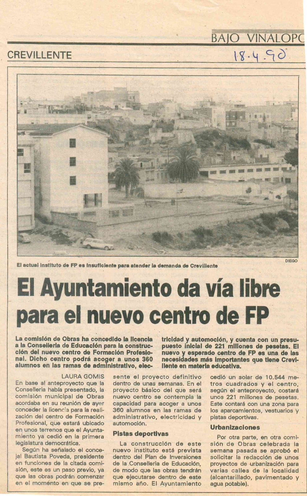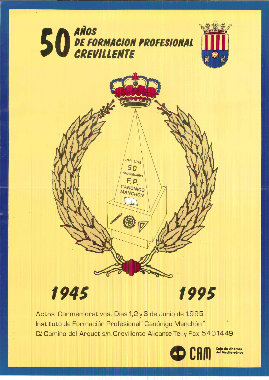 Tras una década de gestiones por parte del Ayuntamiento y la Subdirección General de Formación Profesional, el centro se trasladó a la Partida Arquet, inaugurándose el 10 de noviembre de 1993. Dos años después, entre el 1 y el 3 de junio de 1995, tuvo lugar la conmemoración del cincuenta aniversario de la escuela profesional en Crevillent, dando lugar a medio siglo de historia de esta institución educativa.
