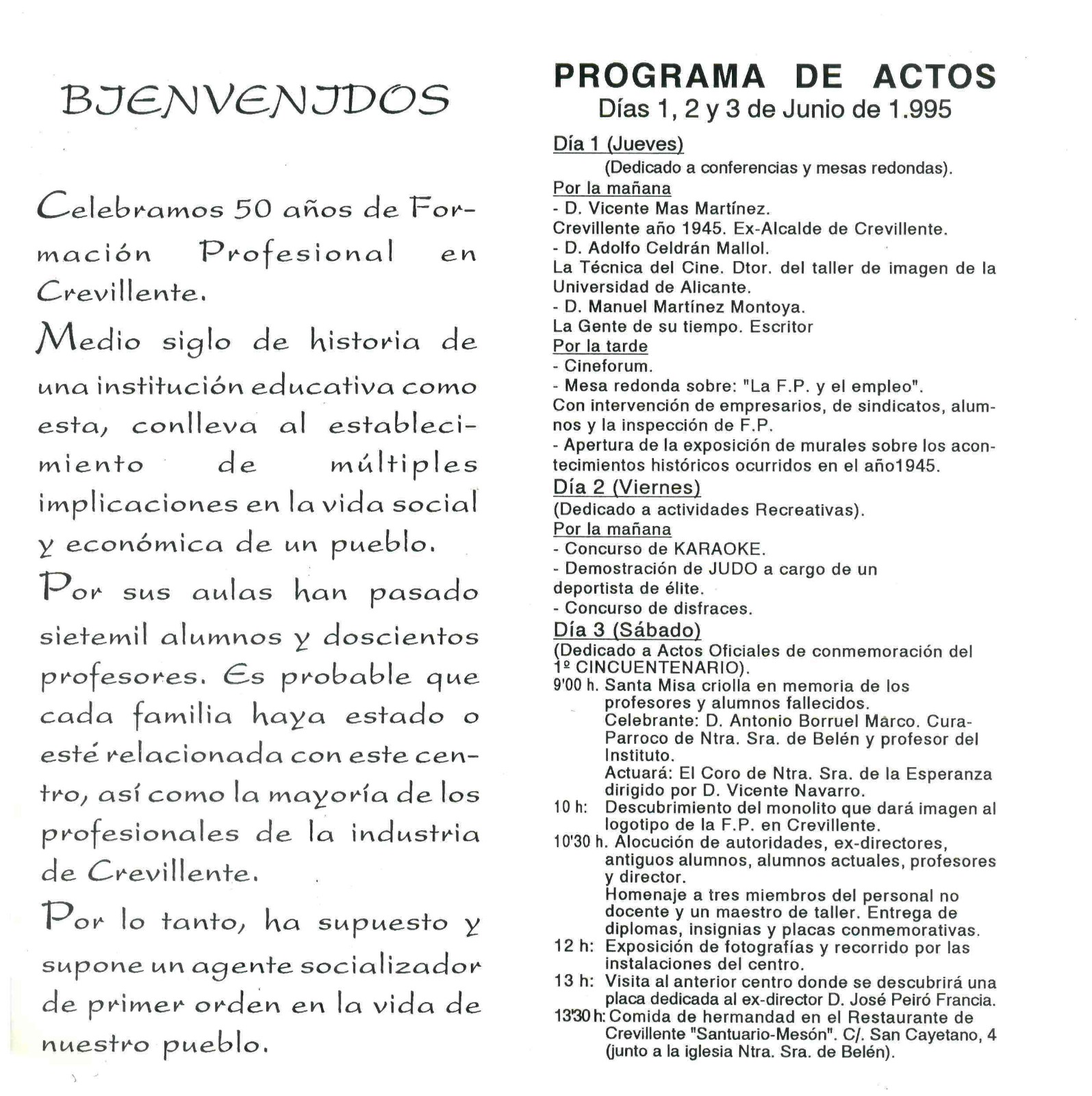 Entre els actes programats va haver-hi conferències amb la intervenció de Vicente Mas Martínez, exalcalde, Manuel Martínez Montoya, escriptor, així com una taula redona formada per empresaris, sindicalistes i alumnes. També va haver-hi temps per a activitats recreatives com un concurs de karaoke, una demostració de judo, un homenatge als antics mestres i alumnes, santa missa, una exposició de fotografies i el descobriment d’un monòlit i una placa en honor al director que va ser del centre Sr. José Peiró França, per a finalitzar amb un menjar.