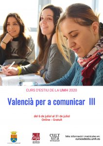 La temàtica seleccionada per als cursos d’enguany és, d’una banda i continuant amb els cursos dedicats al valencià, “El valencià per a comunicar III”, la docent del qual serà Rosa María Asencio Asencio, utilitzant com a metodologia vídeos gravats prèviament, un fòrum per a posades en comú i dubtes generals, el correu electrònic per a l’atenció personalitzada amb el docent, resoldre dubtes i fer el seguiment oportú. La duració del curs serà del 6 de juliol al 31 de juliol, sent 25 hores les necessàries per a obtindre el certificat oportú. El curs pot fer-lo l’alumne amb total llibertat, deixant marges de temps perquè puga adaptar-se al mateix en les circumstàncies en les quals ens trobem.