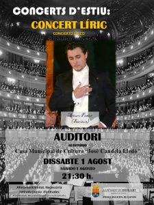 - Tots els dissabtes de juliol, i fins a l’1 d’agost, es podrà gaudir de concerts de diferents estils musicals a les 21:30 hores a l’Auditori de la Casa Municipal de Cultura de manera gratuïta