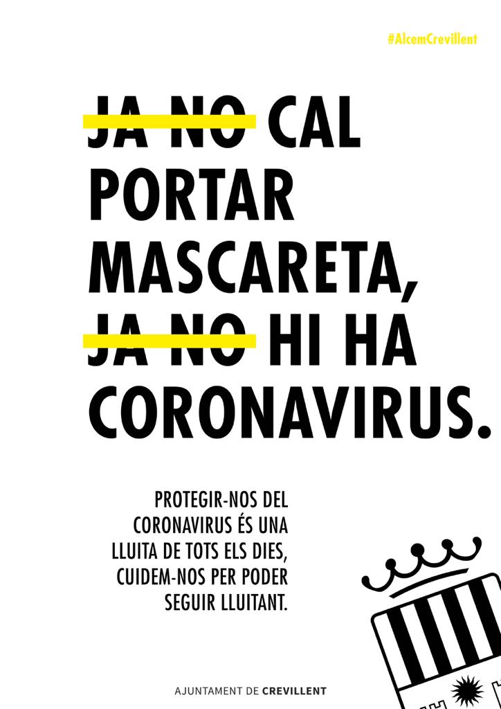 L’Ajuntament està repartint cartells i fullets informatius dins de la campanya “Tombem la corba, alcem Crevillent” per a recordar la importància de seguir les recomanacions sanitàries per a previndre possibles rebrots