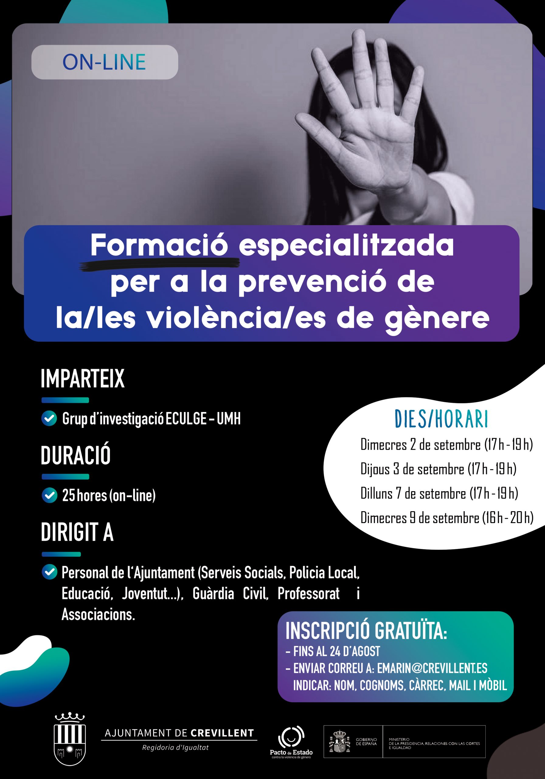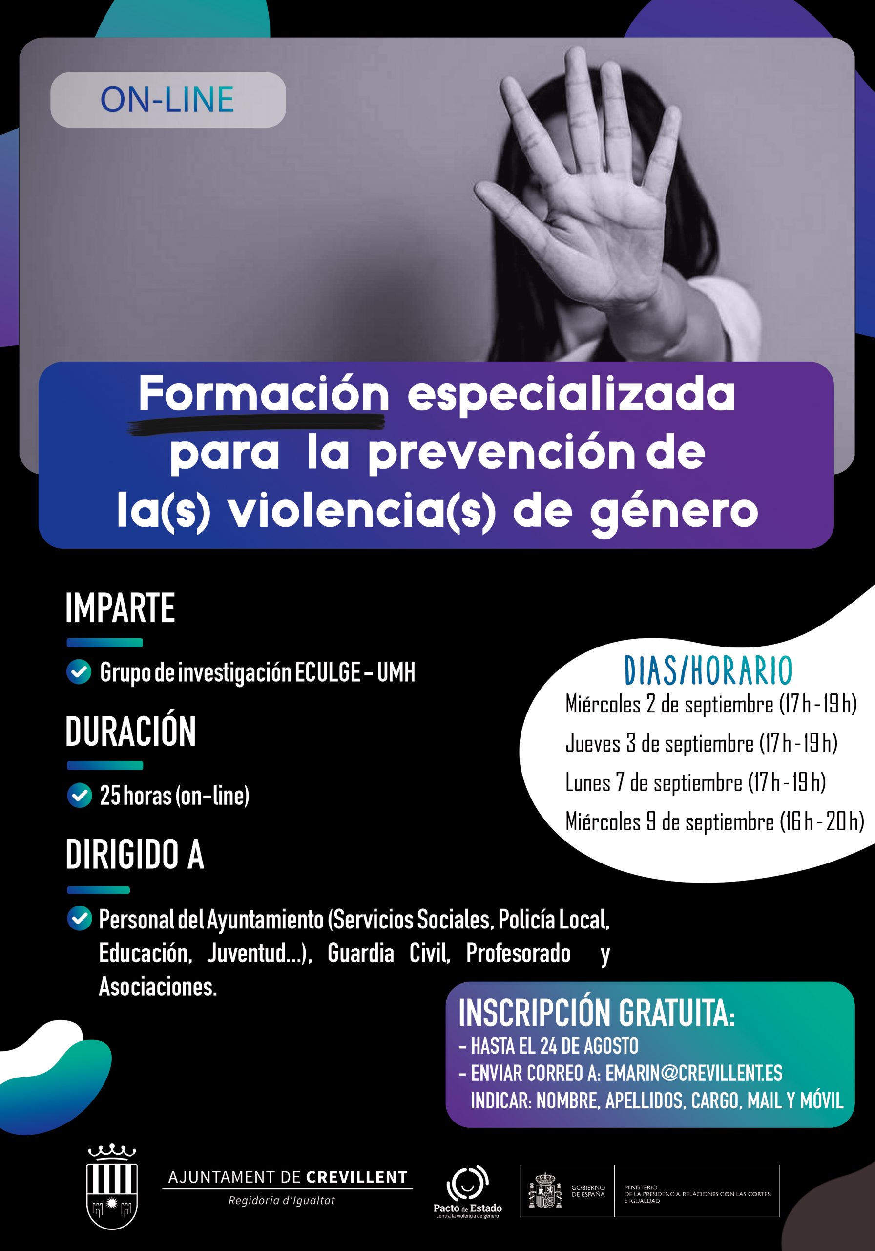 - La Concejalía de Igualdad ofrecerá formación online y gratuita al personal municipal, Guardia Civil, Policía Local, profesorado y asociaciones de Crevillent este septiembre