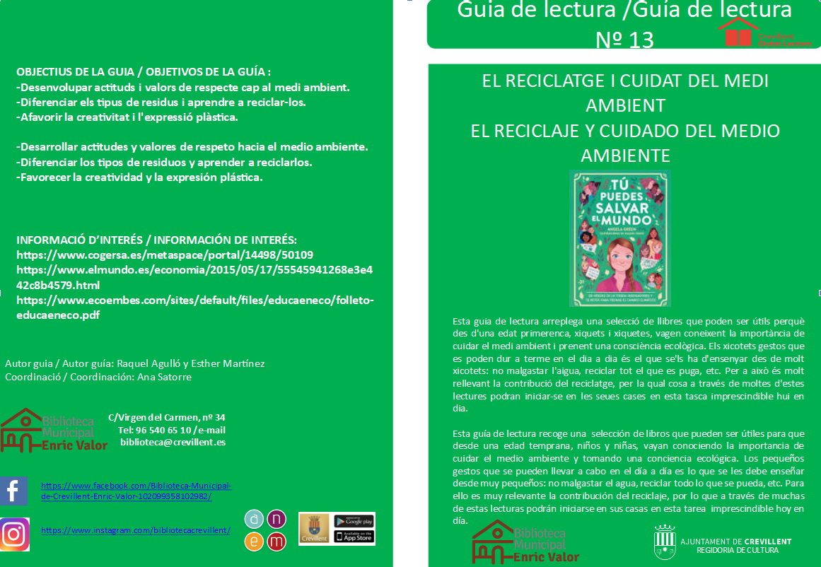 Des de la Biblioteca Municipal volem insistir en esta important problemàtica social i ensenyar als xiquets i xiquetes els xicotets gestos que es poden dur a terme en el dia a dia, com no malgastar l’aigua, reciclar,… a través de lectures lúdiques i divertides amb les que podran iniciar-se en esta tasca imprescindible hui en dia.