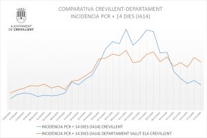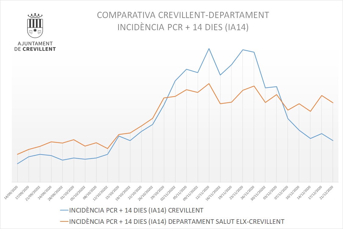 Aquestes dades han d’alertar a la població crevillentina ja que, si bé hem tingut una tendència positiva en les últimes setmanes baixant de 400 casos per cada 100 mil habitants a 124 casos, com ha ocorregut en anteriors situacions el que ocorre en altres municipis del departament i en l’entorn acabarà afectant-nos i s’espera que pujarem molt prompte, com així està ocorrent també a la Comunitat Valenciana i en la resta del país.