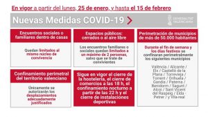 Recordar a la població que demà a les 15.00 hores de la vesprada i fins al dilluns a les 06.00 hores del matí entra en vigor el tancament perimetral dels municipis de més de 50 mil habitants conforme al Decret 2/2021. NO ÉS EL CAS DE CREVILLENT, però donada la nostra proximitat amb els municipis d’Elx, Torrevieja, Orihuela o Alacant, és convenient recordar aquesta mesura adoptada per la Presidència de la Generalitat Valenciana i que estarà vigent tots els caps de setmana fins al 15 de febrer.