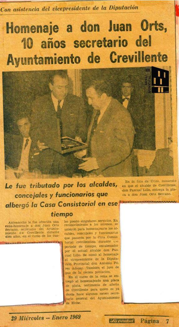 El 28 de gener de 1969 va rebre un merescut homenatge pel seu treball com a secretari a l’Ajuntament de Crevillent, al qual van assistir els alcaldes, regidors i funcionaris que van passar per la Casa Consistorial durant els deu anys de la seua secretaria, encapçalats pel llavors alcalde, Pascual Lillo, i el vicepresident de la Diputació Provincial d’Alacant, l’empresari crevillentí Antonio Pérez Adsuar.
