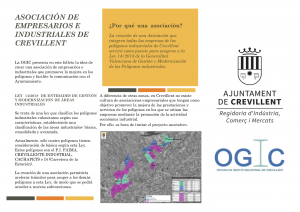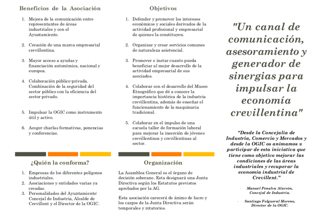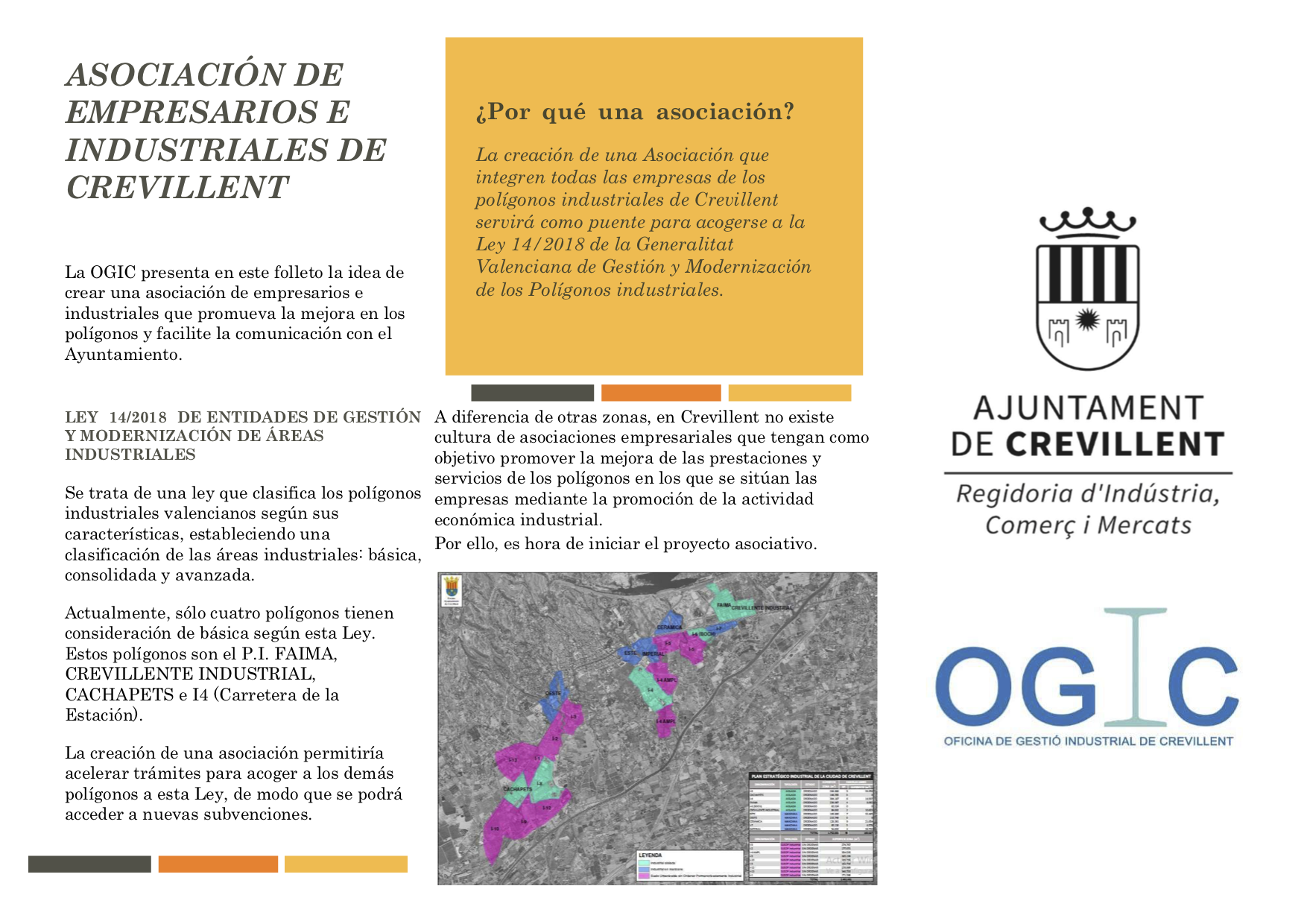 Crevillent (06/04/2021).- La Oficina de Gestión Industrial de Crevillent (OGIC) y la Concejalía de Industria, Comercio y Mercados han preparado un folleto con el propósito de llamar a la creación de una asociación de empresarios e industriales en Crevillent para trabajar en la promoción y mejora en los polígonos y facilitar la comunicación entre los representantes de las áreas industriales y el Ayuntamiento, entre otras.