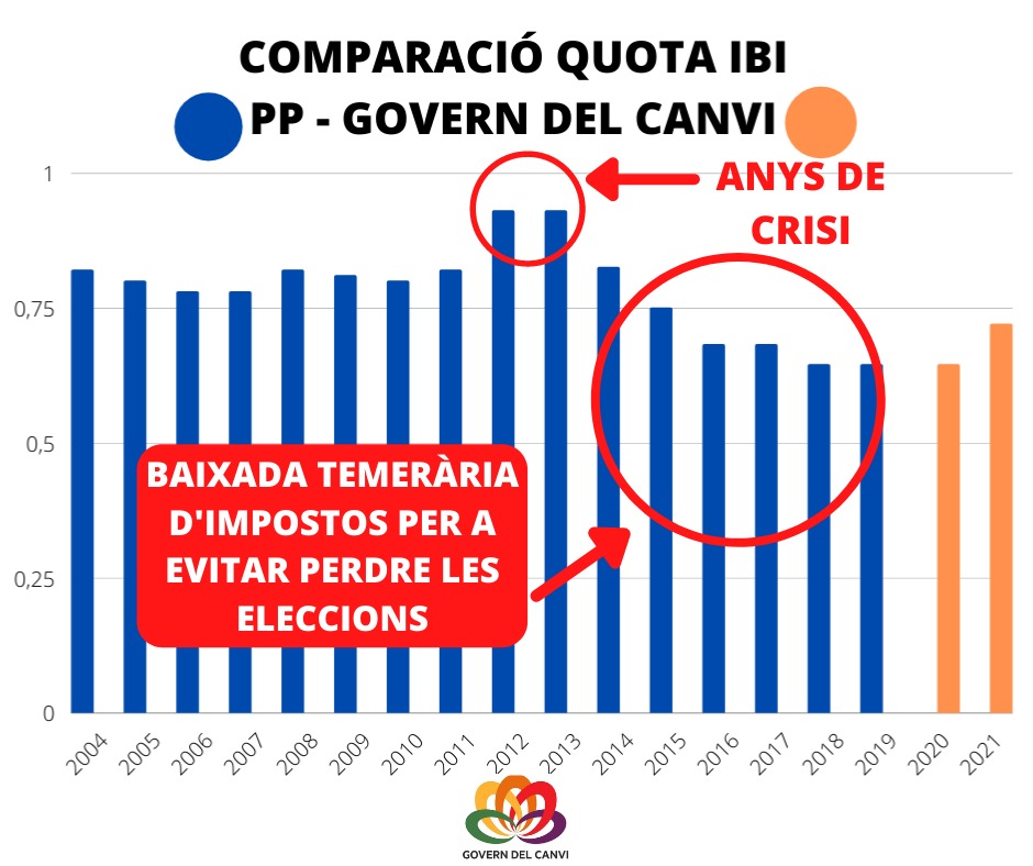 Crevillent (08/04/2021).- El PP continua en la seua línia basada en incongruències i manipulació de la informació. A Crevillent l’IBI només ha passat del 0,64 al 0,72 (augmentant 0,08 dècimes) i continua per davall de la majoria dels municipis d’aquesta categoria. Per què això? Doncs perquè el Partit Popular, després de pujar l’IBI a la quota més alta de la història de Crevillent arribant al 0,93 en plena crisi econòmica, va realitzar una baixada temerària de l’IBI per a donar-se una autorentada de cara davant la proximitat de les eleccions, amb una fi merament electoralista.