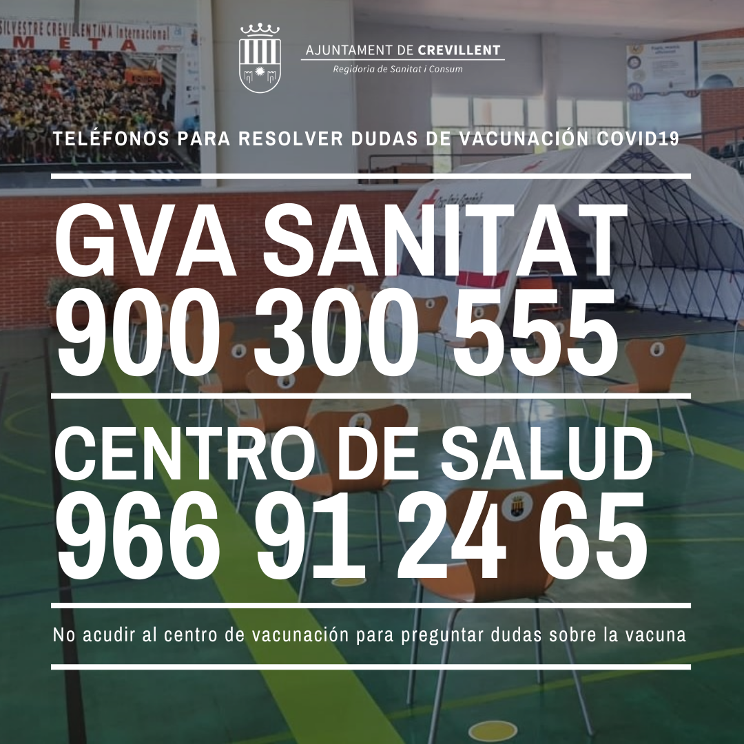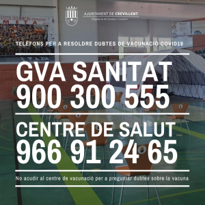 Gema Candelaria ha apuntat que davant qualsevol dubte o consulta sobre els certificats o la vacunació es pot contactar amb la Conselleria de Sanitat a través del telèfon 900 300 555. Mentre que les persones que no s’han vacunat, havent passat la seua edat, han de posar-se en contacte amb el Centre de Salut telefonant al 966 912 465. “És molt important que les persones que tinguen dubtes sobre la vacunació i no tinguen cita mitjançant SMS no acudisquen al Félix Candela per a no alentir el procés de vacunació”. Fins ara, el nombre de crevillentins i crevillentines vacunats és de 15.340, dels quals 10.088 compten amb la primera dosi i 5.262 amb les dues.