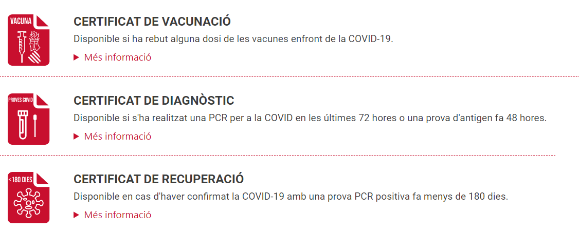 1. Certificat de recuperació: acredita a través d’un codi QR que la persona s’ha recuperat del coronavirus després d’haver confirmat la seua malaltia mitjançant una prova PCR positiva. És vàlid des de la finalització del període d’aïllament, dia 11 de la prova PCR positiva, fins a 180 dies després.