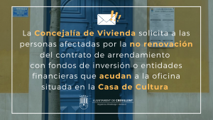 Crevillent (25/06/2021).- Desde la Concejalía de Vivienda se hace un llamamiento a todos los vecinos y vecinas de Crevillent que vienen de una ejecución hipotecaria, dación en pago o que, por cualquier otro motivo, tienen un contrato de arrendamiento con una entidad financiera o fondo de inversión y que han recibido una carta en la que se especifica no se quiere renovar.