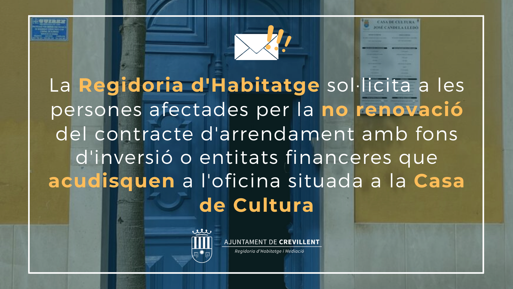 - La Concejalía de Vivienda solicita a los vecinos y vecinas de Crevillent que han recibido una notificación comunicando que no se va a renovar su alquiler que se pongan en contacto con este área