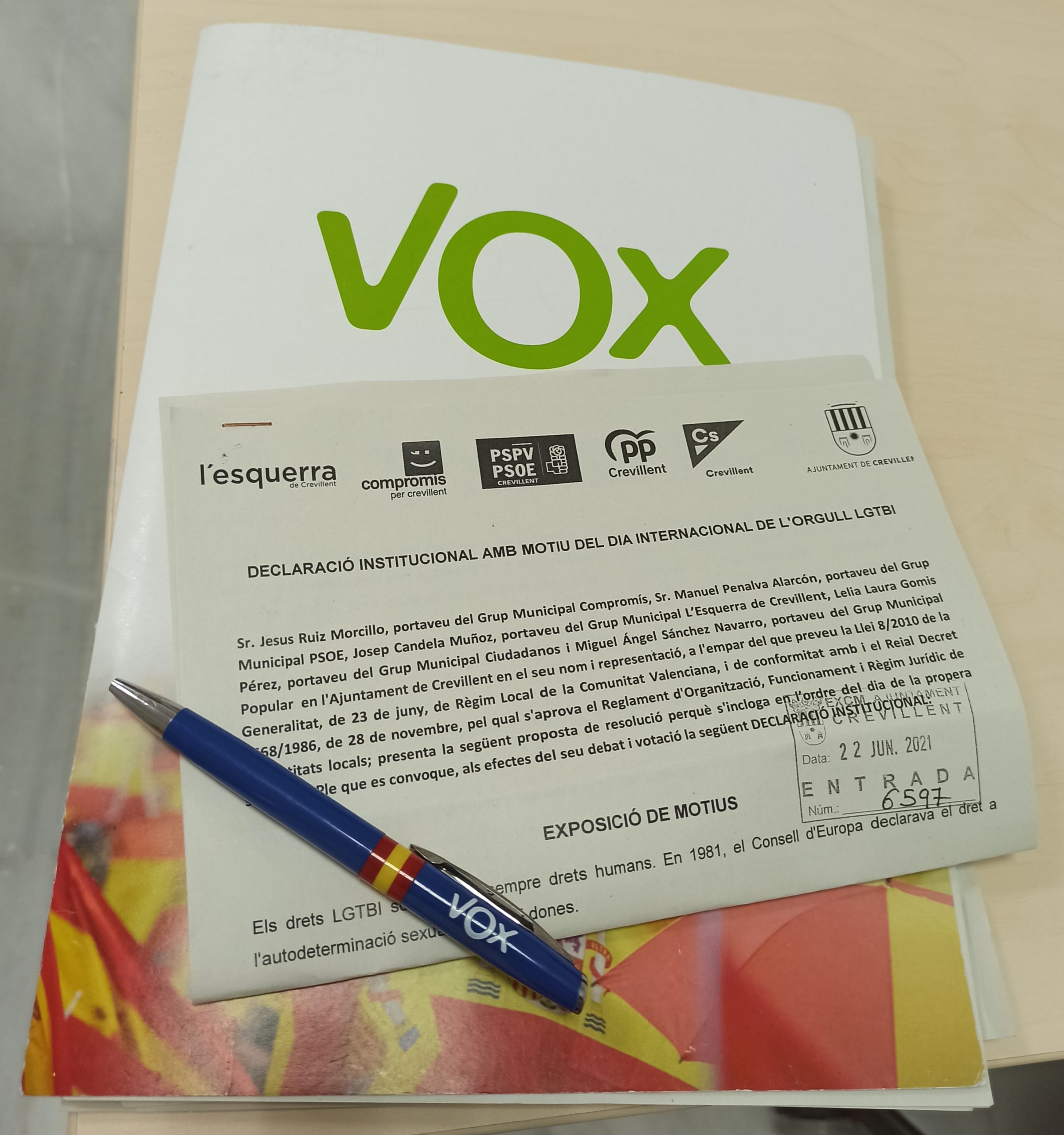 Por si alguien no ha entendido la declaración, está en catalán, y hablan, como siempre, de la discriminación que sufren las personas LGTBI, de los derechos que tienen las personas LGTBI, que las personas LGTBI que son víctimas de violencia y discriminación se han visto gravemente afectadas por esta pandemia del Covid-19, (esto no se entiende muy bien, pero está en la declaración), se habla de un discurso del odio hacia las personas LGTBI… simplemente por no rendir pleitesía a un colectivo que no representa fielmente la realidad cotidiana de las personas homosexuales o lesbianas que, viven en perfecta armonía con el resto de la ciudadanía crevillentina y que no creen necesario enarbolar ninguna bandera en defensa de su orientación sexual.
