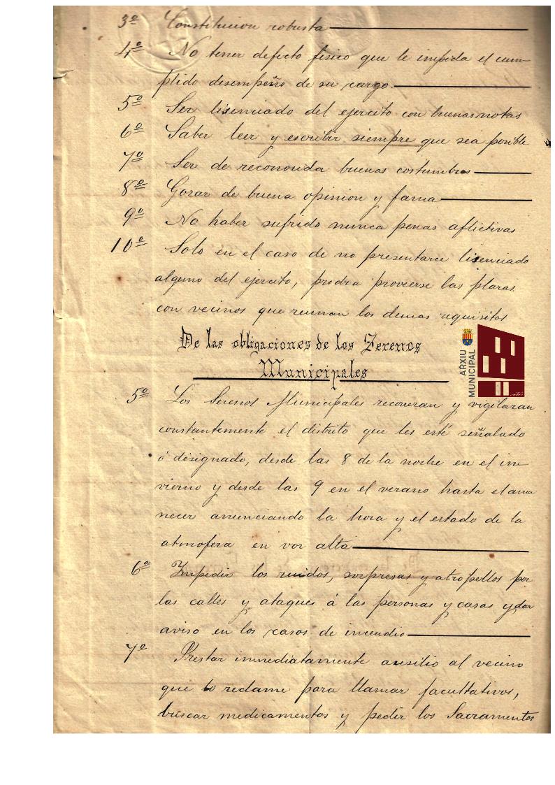 Quant a les obligacions, aquests funcionaris havien de recórrer i vigilar el districte assignat, des de les 8 de la nit a l’hivern i les 9 a l’estiu, fins a l’alba, “anunciant l’hora i l’estat de l’atmosfera en veu alta,” per al que havien de tindre una bona veu, element que també es tenia en compte per al seu nomenament.