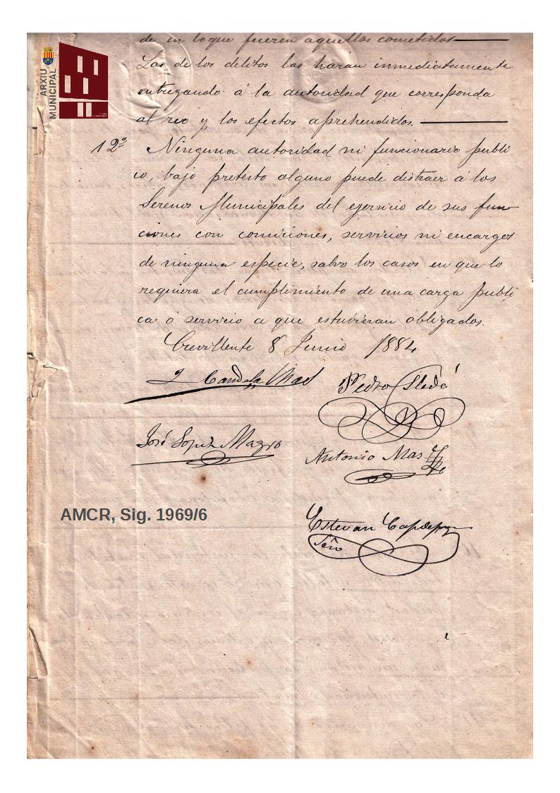 El 8 de junio de 1884, el Ayuntamiento de Crevillent aprobaba el primer Reglamento para la organización y establecimiento de los serenos municipales, que recoge las condiciones de acceso y obligaciones, en un total de 12 artículos.