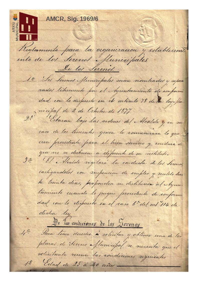 AMCR. Municipal, Reglamento para la organización y establecimiento de los serenos municipales, 1884, Sig. 1969/6. Manuscrito.