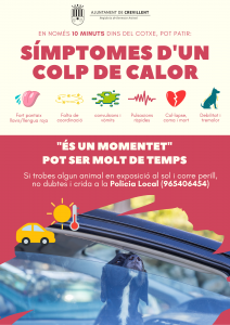 Ana Vanesa Mas, regidora de l’àrea, ha explicat que en tan sols 10 minuts d’exposició al sol o a la calor les nostres mascotes poden patir símptomes com feblesa, tremolor, pulsacions ràpides, vòmits, col·lapse o fins i tot morir-se a causa d’un colp de calor (hipertèrmia). Per aquest motiu, l’edil ha insistit en la importància de deixar als animals en un lloc fresc protegit del sol i que la mascota tinga a la seua disposició aigua fresca i neta en tot moment, sobretot en les hores més crítiques del dia.