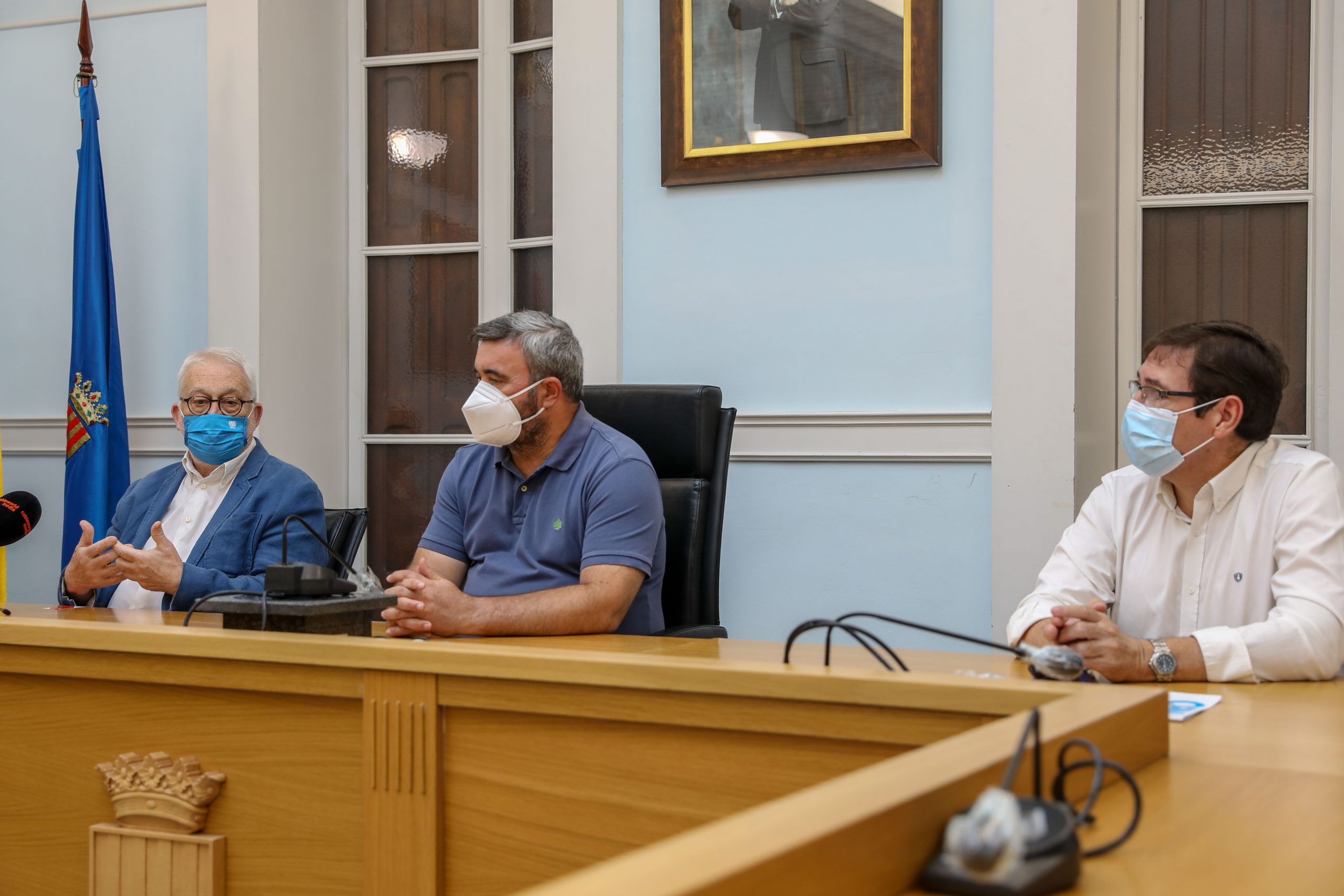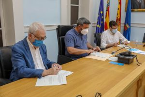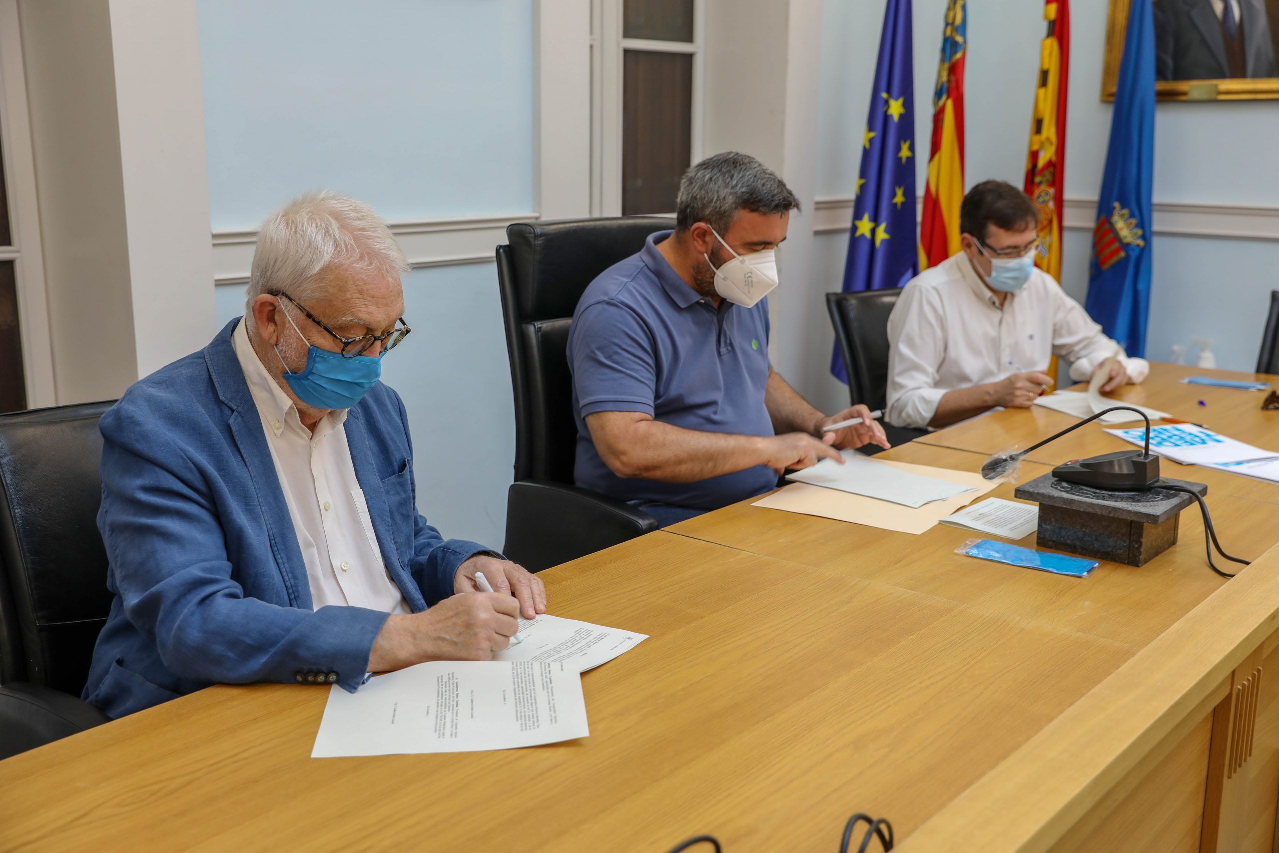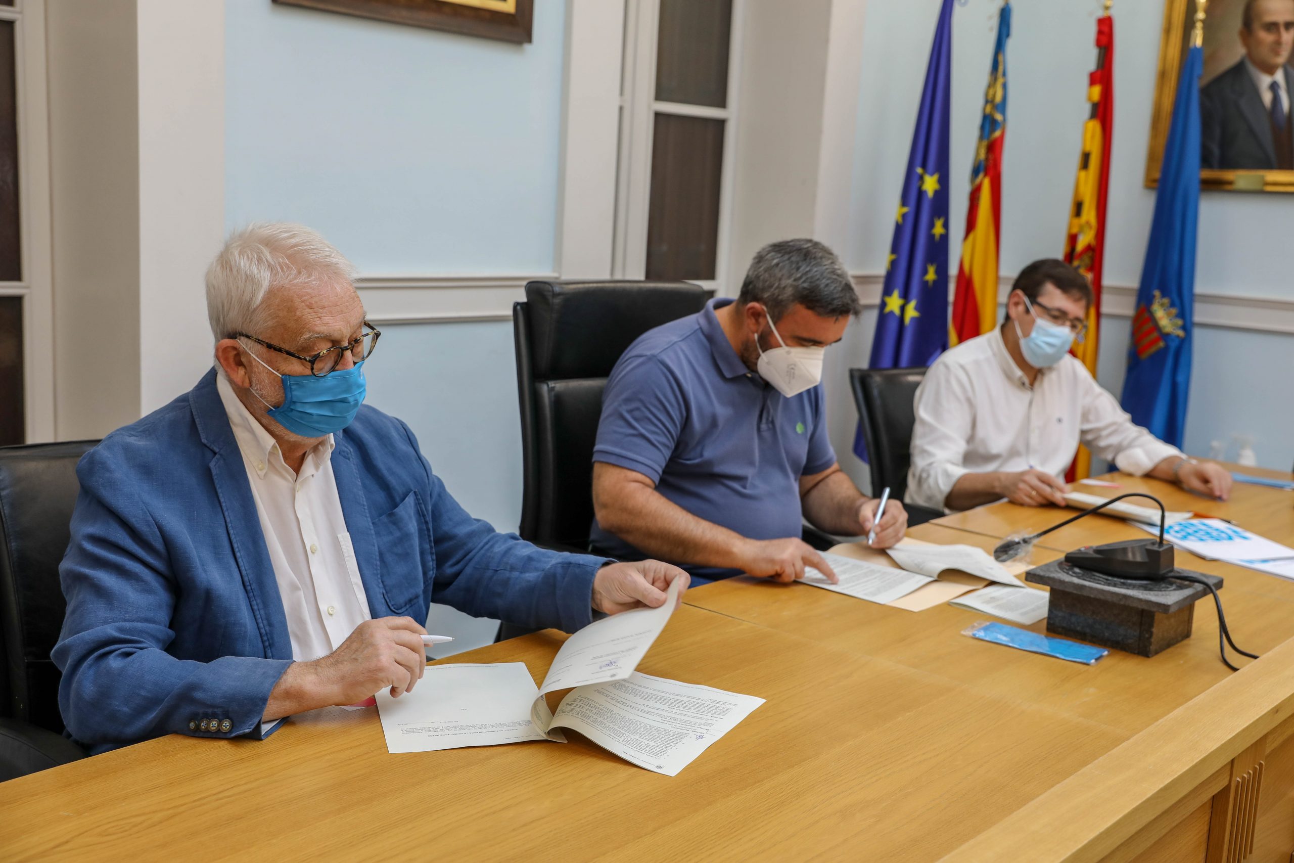 L’alcalde, José Manuel Penalva, el president de Fundación Mediterráneo, Luis Boyer i el president de Cooperativa Elèctrica, Guillermo Belso, han rubricat aquest document pel qual es dona continuïtat a la col·laboració iniciada en 2018 per a l’impuls del Centre de Medi Ambient en Els Molins, propietat de la Fundació.