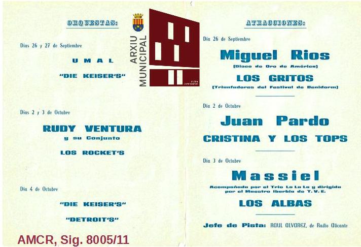 Las actuaciones abarcaban los días 26 y 27 de septiembre, 2, 3 y 4 de octubre en las que había orquestas y atracciones. Entre las primeras actuaron la orquesta Umal, Die Keiser’s, Rudy Ventura, Los Rocket’s y Detroit’s, que reunían a gran cantidad de crevillentinos y crevillentinas que ocupaban el patio del instituto a modo de pista de baile, adonde las señoras acudían con traje largo y los señores vestían de etiqueta.