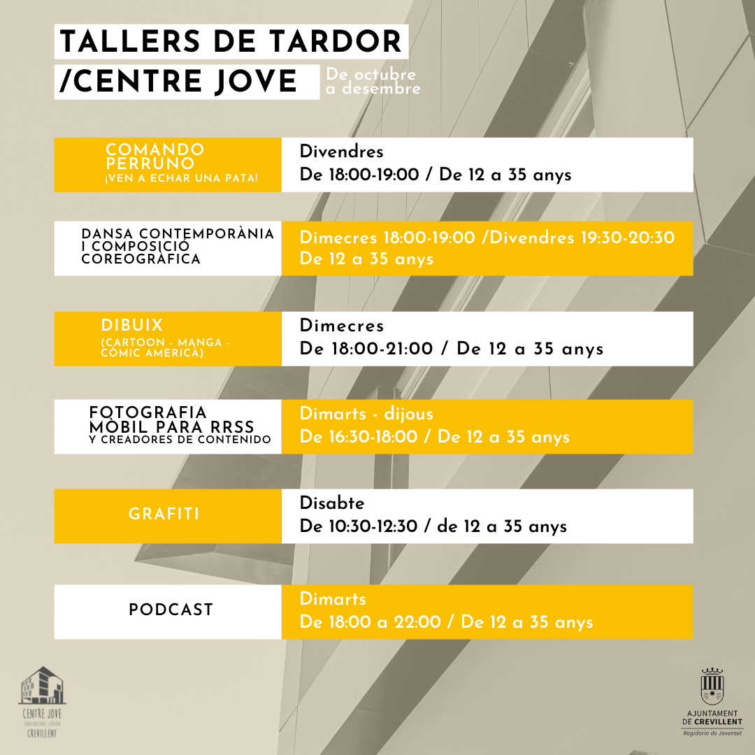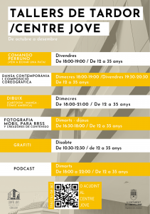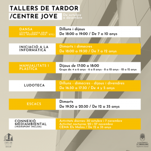 - Organitzats per Joventut, arrancaran el 13 d’octubre dins i fora del Centre Jove amb algunes novetats com la fotografia mòbil per a xarxes socials, “Comando perruno” o un taller de podcast, contemplant també activitats en família