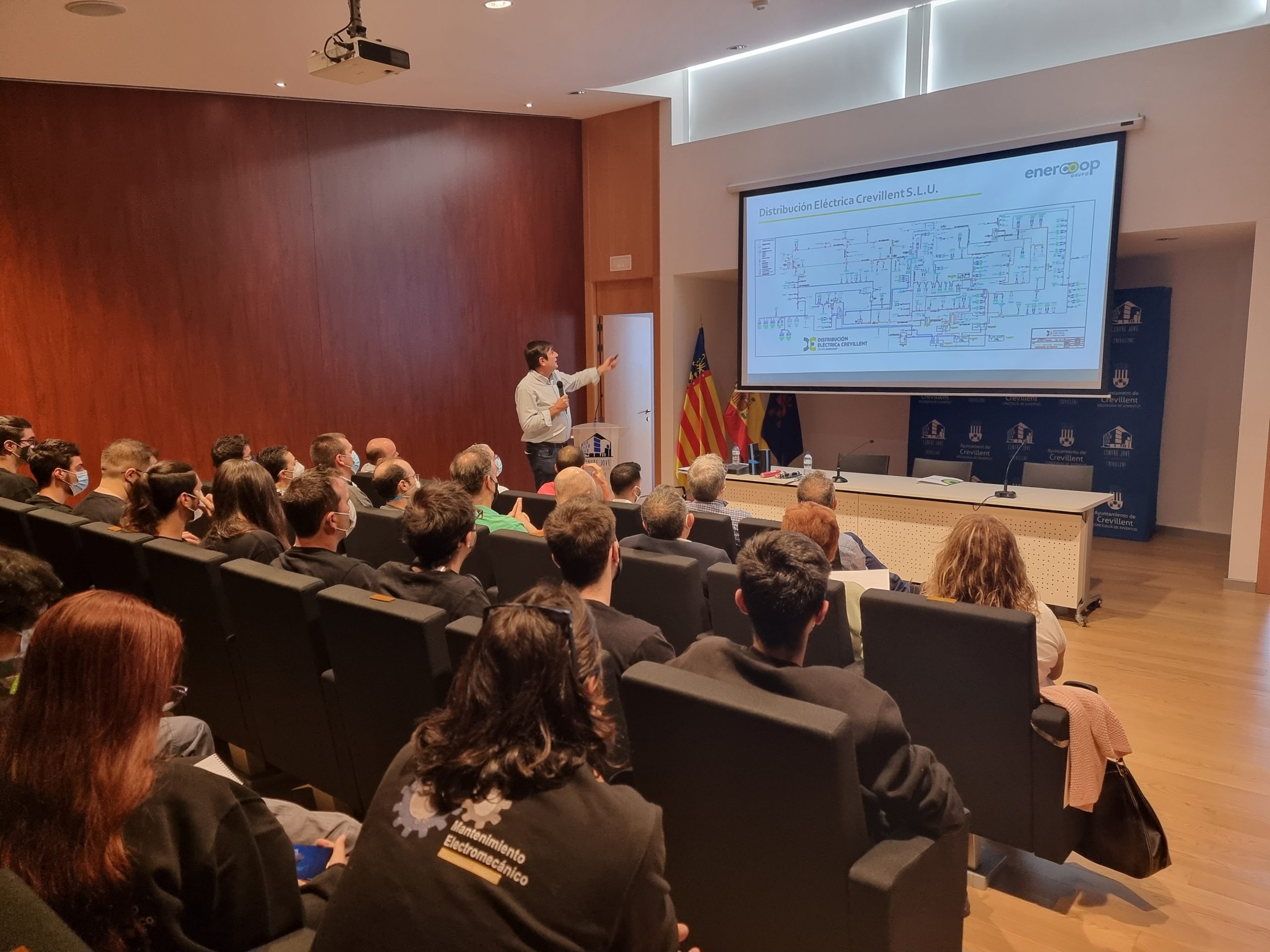 diversas ponencias dictadas por directores de área y responsables de la compañía. El primero en dirigirse a los alumnos ha sido Salvador Pérez, director financiero del Grupo Enercoop, quien ha abordado a través de la ponencia “De la Cooperativa al Grupo Enercoop: un siglo de expansión” los principales hitos alcanzados por el Grupo hasta consolidarse como un referente sectorial con actividad de producción, distribución y comercialización de energía. Por su parte, José Javier Soriano, responsable del departamento de Planificación y Gestión de Red, ha centrado su exposición en la red de “Distribución Eléctrica Crevillent” compartiendo con los alumnos las características más relevantes que le confieren fiabilidad y resiliencia. La tercera presentación ha corrido de la mano de Isabel Mas, responsable del departamento de Producción y Transición Energética de la compañía que con la ponencia “COMPTEM: claves de la comunidad energética local pionera en España” ha expuesto al auditorio el modelo con el que Grupo Enercoop está afrontando la transición energética en su evolución natural de cooperativa eléctrica histórica a comunidad energética local haciendo frente a condiciones de contorno tecnológicas, económicas, energéticas, territoriales, normativas y sociales. Por su parte, el encargado de abordar la realidad actual del mercado eléctrico ha sido José García, director del Área de Operaciones del Grupo Enercoop, quien ha presentado a los futuros profesionales los principales retos a los que está haciendo frente el Grupo Enercoop.