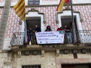 l’Ajuntament amb pancartes i dibuixos reivindicatius, llegint un manifest i col·laborant en la col·locació d’una pancarta al balcó del Consistori.