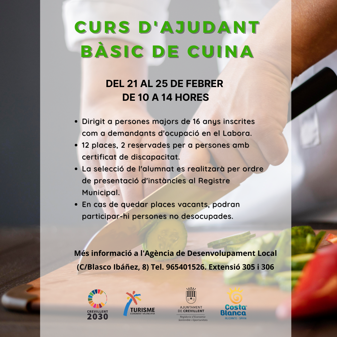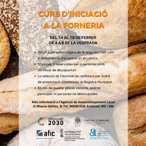 Crevillent (08/02/2022).- La Regidoria d’Economia Sostenible ha organitzat dos cursos de formació per a persones desocupades majors de 16 anys inscrites en el Labora. El primer, d‘Iniciació a la Forneria, s’impartirà del 14 al 18 de febrer, en horari de dilluns a divendres de 16:00 a 20:00 hores. El segon, d’Ajudant Bàsic de Cuina, del 21 al 25 d’aquest mateix mes, en horari de dilluns a divendres de 10:00 a 14:00 hores.