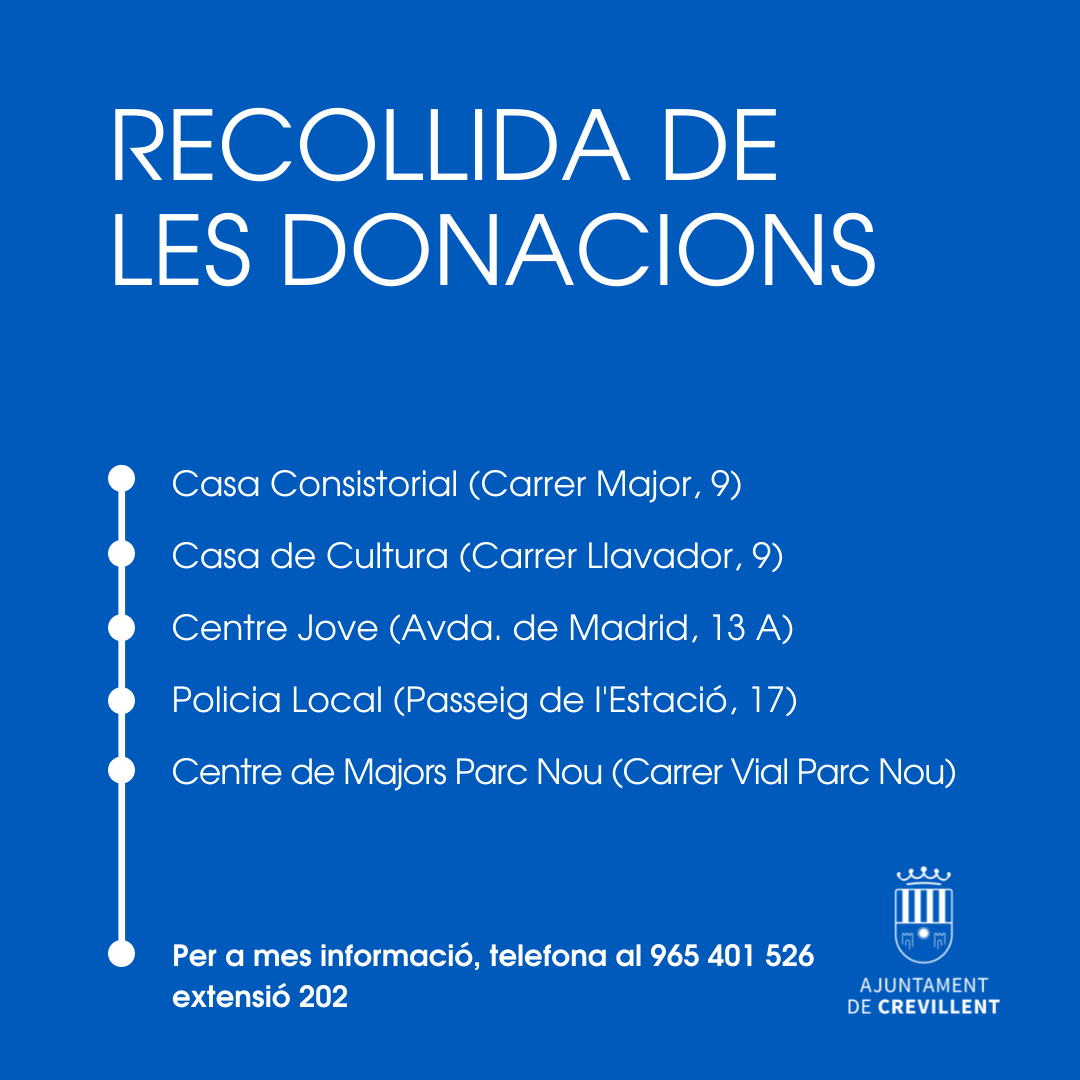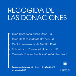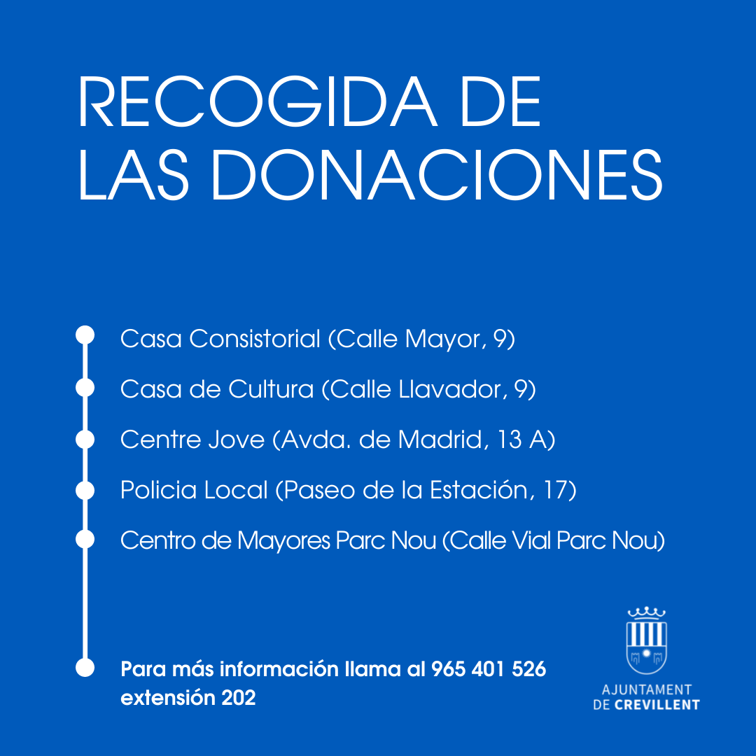 - Los crevillentinos y crevillentinas podrán aportar alimentos, material sanitario, textil o de higiene, entre otros, en la Casa Consistorial, la Casa de Cultura, el Centre Jove, el Centro de Mayores Parc Nou y en la sede de la Policía Local