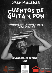 El dia 20 tindrà lloc el següent contacontes “Cuentos de Quita y Pon”, a càrrec de Juan Malabar. Es tracta de contes curts en xicotet format plens d’emoció i gest amb coses de posar i traure, titelles i trastos. Objectes elaborats pel propi narrador i construïts amb diferents materials: suro, fusta, metall, paper, collages, ferralla i sobretot coses velles oblidades i rescatades. Ambdues activitats es realitzaran a les 18 h i seran d’accés lliure fins a completar l’aforament.