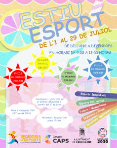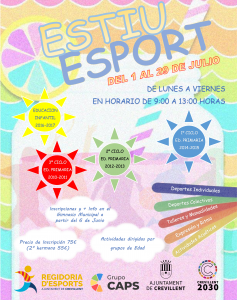 Crevillent (24/04/2022).- La Regidoria d’Esports posarà en marxa el pròxim 6 de juny la matriculació per al programa “Estiu Esport”, l’escola d’estiu esportiva enfocada a xiquets i xiquetes d’Infantil i Primària, d’entre 4 i 12 anys.. Les inscripcions es podran realitzar a partir d’aquest dia al Gimnàs i la Piscina Municipals en horari de 8.00 a 22.00 hores.