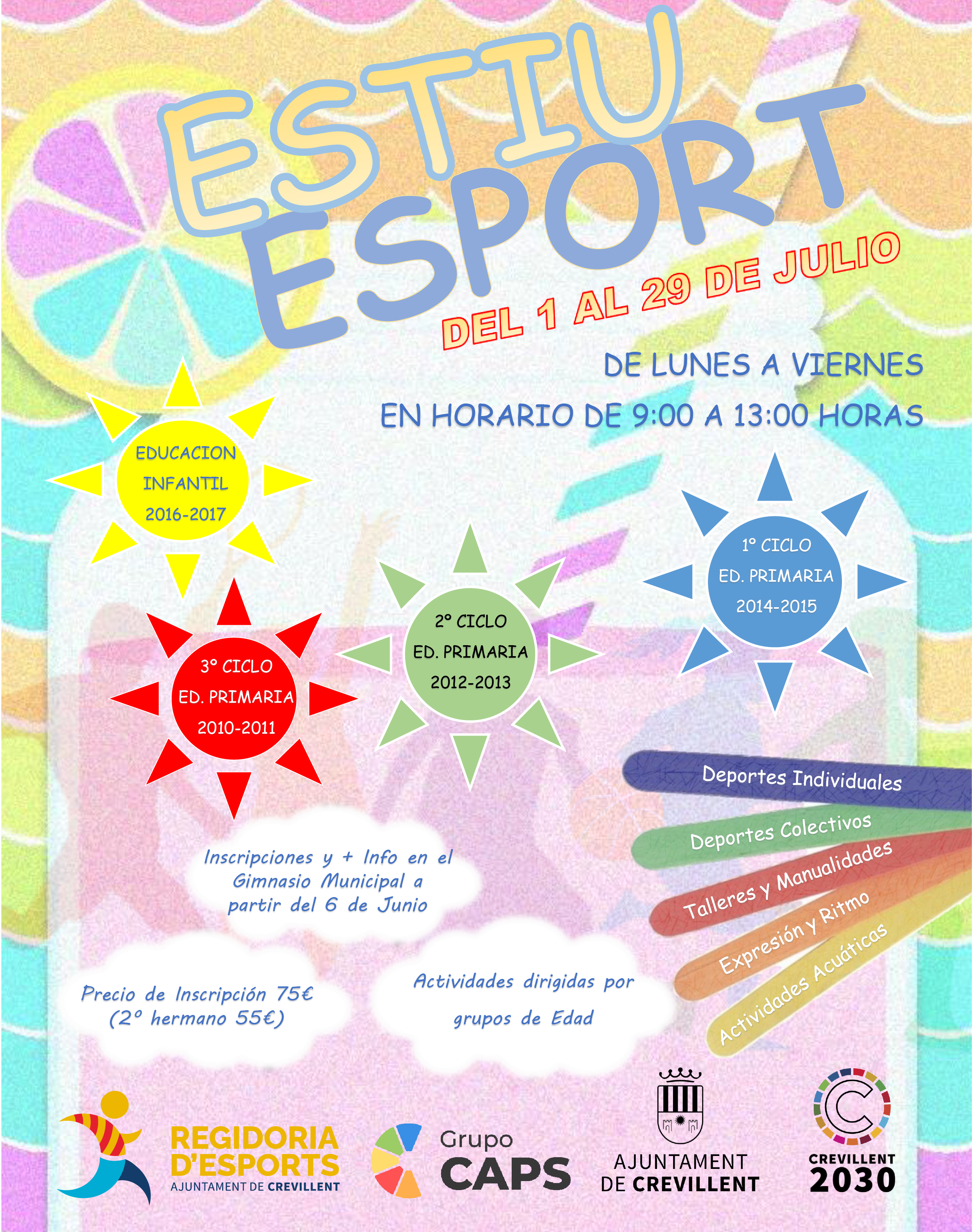 Els xiquets i xiquetes d’Educació Infantil i Primària podran gaudir d’activitats aquàtiques, esportives, manualitats i altres tallers de l’1 al 29 de juliol. La Regidoria d’Esports indica que enguany s’ha incrementat el nombre de participants i les inscripcions es realitzaran al Gimnàs i la Piscina Municipals de 8.00 h a 22.00 h