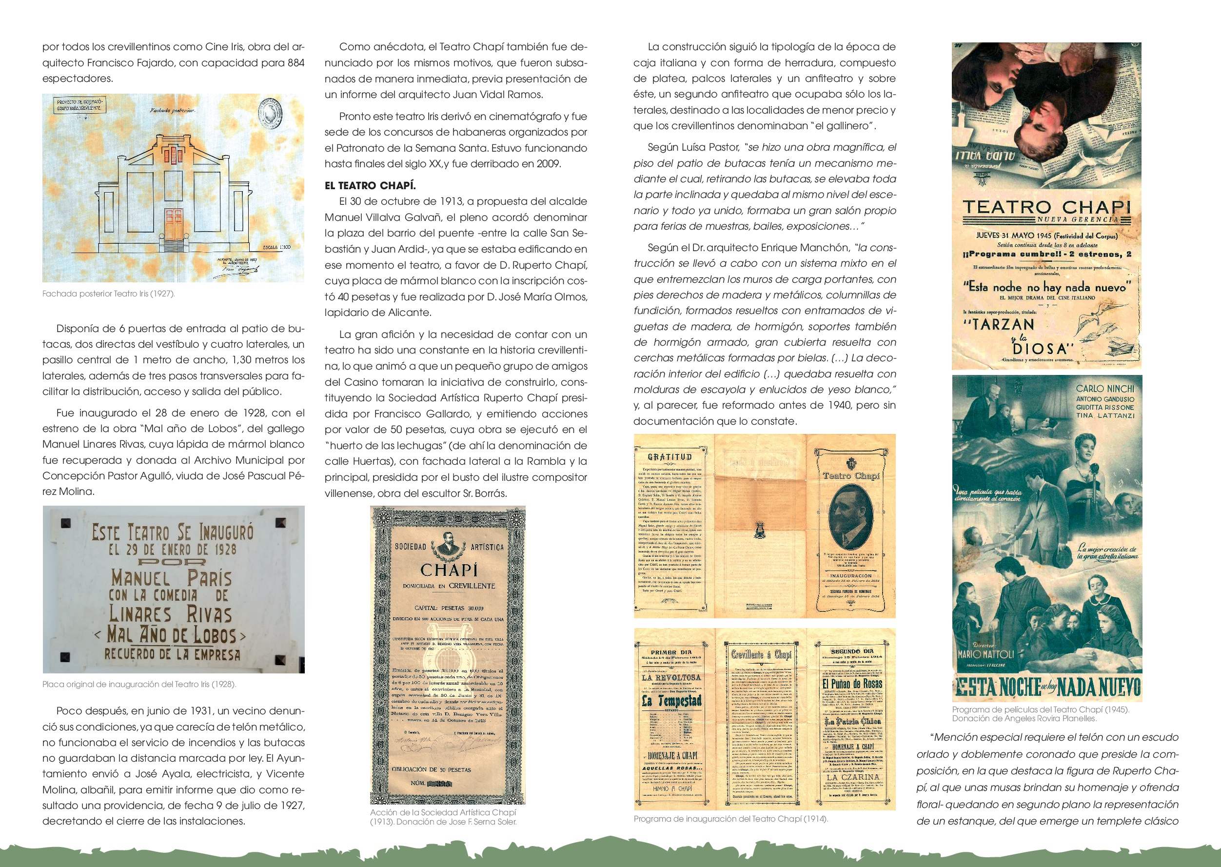 En este número se realiza un breve recorrido por cada uno de estos pequeños teatros como el Eslava, el teatro del Orfeón Crevillentino, las Bóvedas, hasta llegar a la fundación del Teatro Chapí en 1914 y el Teatro Iris en 1928, ambos de iniciativa privada y que han formado parte de la historia cultural crevillentina hasta finales del siglo XX, cuando ambos fueron derribados.