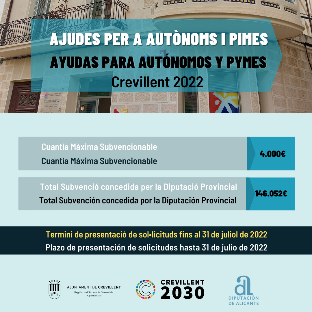 L’alcalde crevillentí, José Manuel Penalva, ha indicat que, en aquesta ocasió, las ajudes venen finançades per la Diputació d’Alacant i la seua quantia és de 146.052€ a repartir entre tots els sol·licitants, que han de complir els requisits necessaris, entre ells comptar amb menys de 10 treballadors, mentre que la quantitat màxima que podrà percebre’s és de 4.000 euros.