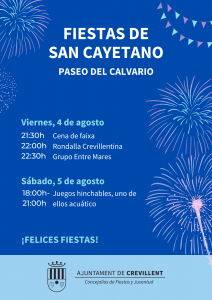 Crevillent (02/08/2023).- Las Concejalías de Fiestas y de Juventud del Ayuntamiento de Crevillent han diseñado un programa con diversas actividades para impulsar las Fiestas de San Cayetano durante los próximos días viernes 4 y sábado 5 de agosto en el Paseo del Calvario.