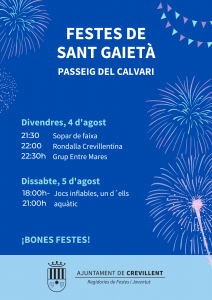 Crevillent (02/08/2023).- Les Regidories de Festes i de Joventut de l’Ajuntament de Crevillent han dissenyat un programa amb diverses activitats per a impulsar les Festes de Sant Gaietà durant els pròxims dies divendres 4 i dissabte 5 d’agost en el Passeig del Calvari.