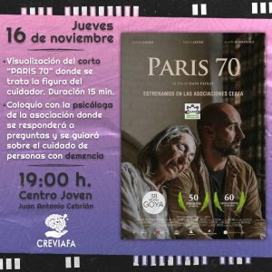 La asociación CREVIAFA proyectará el próximo 16 de noviembre el corto “PARIS 70” con motivo del alzheimer.