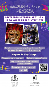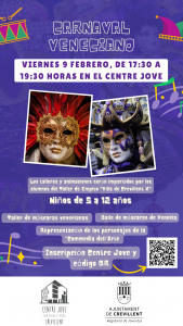 El edil de Juventud ha subrayado que este viernes 9 de febrero también habrá talleres y actividades en el Centre Jove “Juan Antonio Cebrián”, en horario de 17:30 a 19:30 horas. En concreto, el edil ha relatado que “entre las actividades, dirigidas a niños y niñas de entre 5 y 12 años, encontramos un taller de máscaras venecianas, de baile de máscaras de Venecia, así como una representación de los personajes de la Commedia dell’Arte”. Los interesados en participar en dichas actividades tienen que inscribirse presencialmente en el Centre Jove o a través de la instancia genérica de cursos.