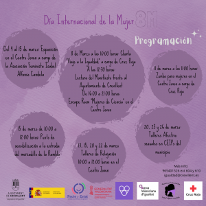 L’edil d’Igualtat ha explicat que ja des de hui dilluns 4 de març es pot visitar una exposició en el Centre Jove “Juan Antonio Cebrián”, a càrrec de l’Associació Feminista Isabel Alfonso Candela. Esta mostra estarà visitable fins al pròxim 15 de març. L’edil Pilar Mas ha manifestat que “des de la Regidoria hem preparat una sèrie d’activitats al llarg del mes de març perquè apostem per la visibilització de la dona no sols el 8M, sinó durant tot el mes amb tot tipus d’activitats culturals i lúdiques”. La regidora ha destacat que “enguany ens hem centrat en la importància de la cura de la salut i el foment de la participació de les dones en l’esport amb un taller de zumba a càrrec de Creu Roja, així com de tallers de relaxació per a dones finançats amb els Fons del Pacte d’Estat contra la Violència de Gènere”.