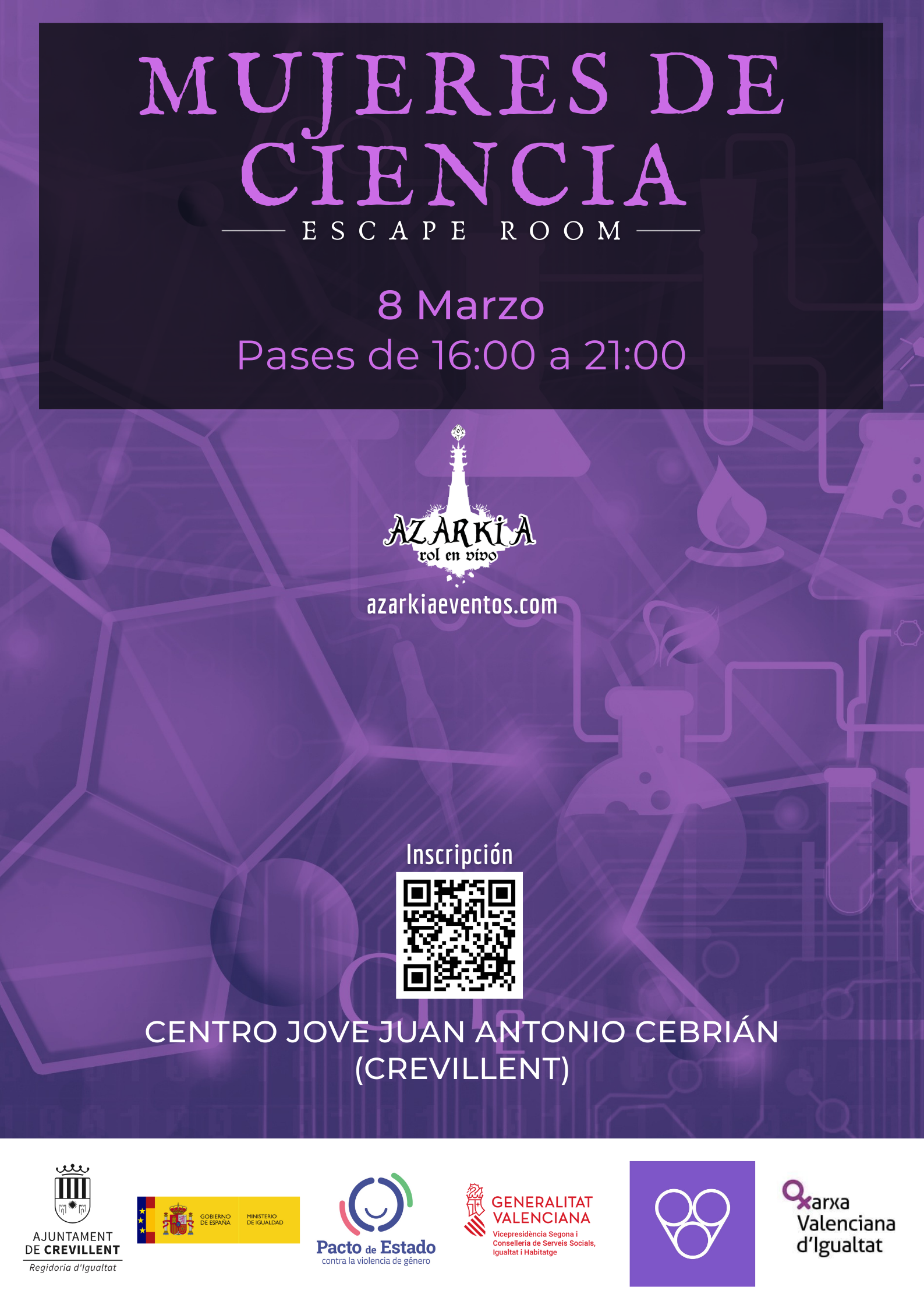 En detalle, el 8 de marzo, Día Internacional de la Mujer, a las 10:00 horas se celebrará la charla titulada “Viaje a la Igualdad”, a cargo de Cruz Roja. A continuación, a las 12:30 horas tendrá lugar la lectura del Manifiesto a las puertas del Ayuntamiento de Crevillent. Según ha señalado la edil, “el manifiesto se ha difundido a los centros educativos para que en la medida de lo posible se sumen a la lectura”. Por la tarde, se ha programado un escape room con la temática de “Mujeres de Ciencia” en el Centre Jove en horario de 16:00 a 21:00 horas. Las personas interesadas en participar en este escape room deberán inscribirse a través del código QR sobreimpresionado en la cartelería del evento o bien a través del siguiente enlace https://docs.google.com/forms/d/e/1FAIpQLScxqvx4rW6k8tu2bkjg-Z7ZXxdNesLOC5mg9F492g2fG2gzDA/viewform