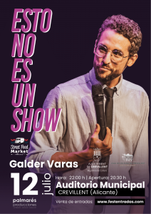 Galder Varas vendrá a Crevillent a representar su espectáculo “Esto no es un show, de Galder Varas”. Este cómico y guionista es una figura destacada en el mundo del humor. Su experiencia incluye colaboraciones en Comedy Central, La Resistencia y Neox. Actualmente, forma parte del programa “Últimos Fichajes” de Movistar. Como pionero del stand-up desde 2017, Galder gestiona su propio sello de comedia, La Bromerie, en la sala Abonavida de Madrid, ofreciendo actuaciones casi todas las semanas. Este sello destaca por presentar una selección de nuevos cómicos de la escena madrileña, y Galder también es el presentador de las grabaciones de Phi Beta Lambda.