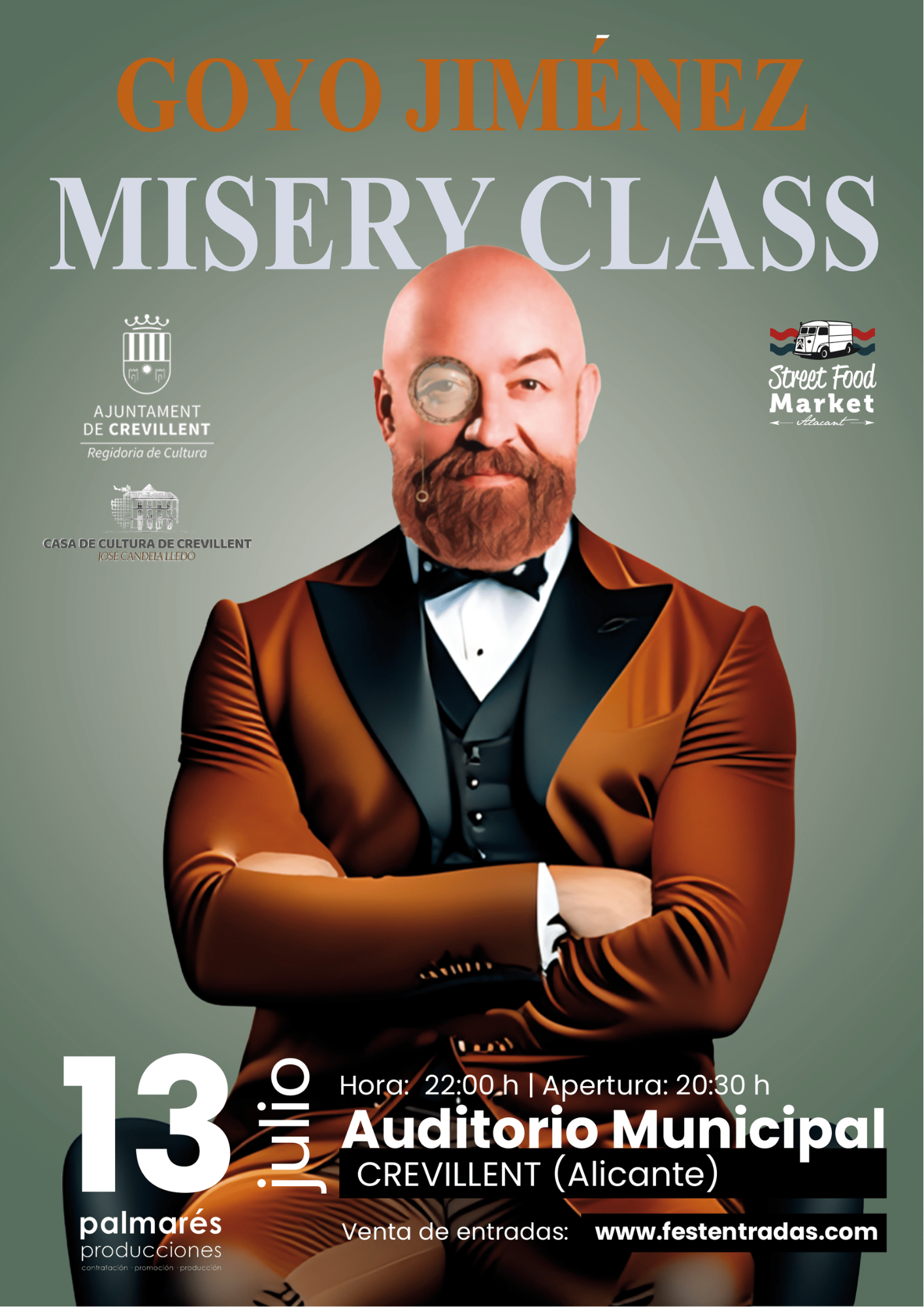 Por su parte, Goyo Jiménez actuará bajo su show “Misery Class” en el que se pasará revista de temas de actualidad, conjugados con el humor del cómico manchego. Podríamos señalar que este nuevo espectáculo de Goyo Jiménez surge desde su visión del mundo como persona y no como personaje.