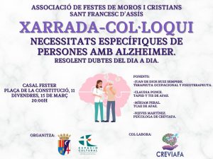 Este próximo viernes 15 de marzo a las 20.00 hrs, siguiendo con las actividades que se enmarcan dentro del Espai Cultural de la Asociación de Fiestas de Moros y Cristianos San Francisco de Asís en colaboración con Creviafa Crevillent, tendrá lugar la charla-coloquio “Necesidades específicas de personas con Alzheimer, resolviendo dudas del día a día”.
