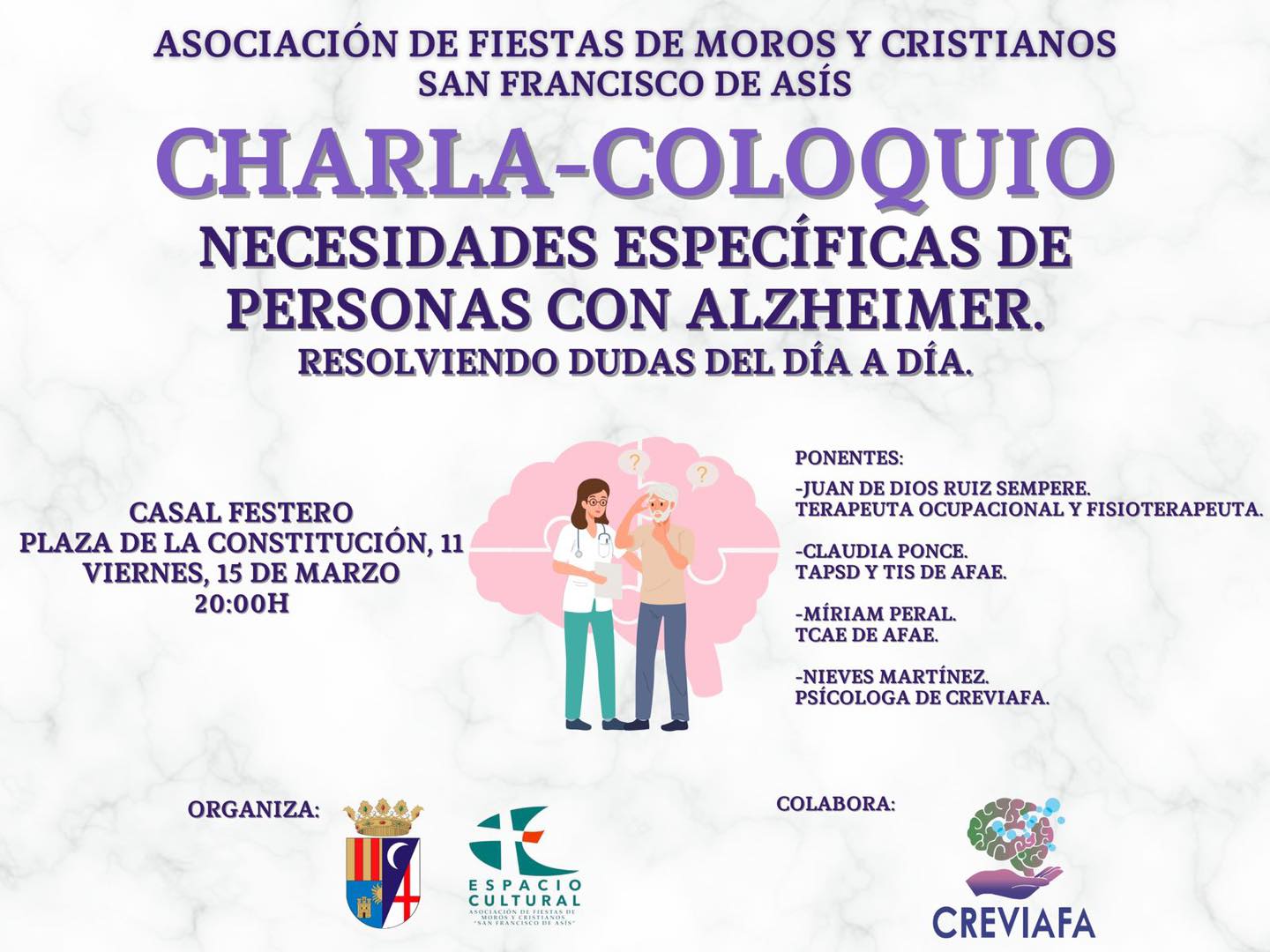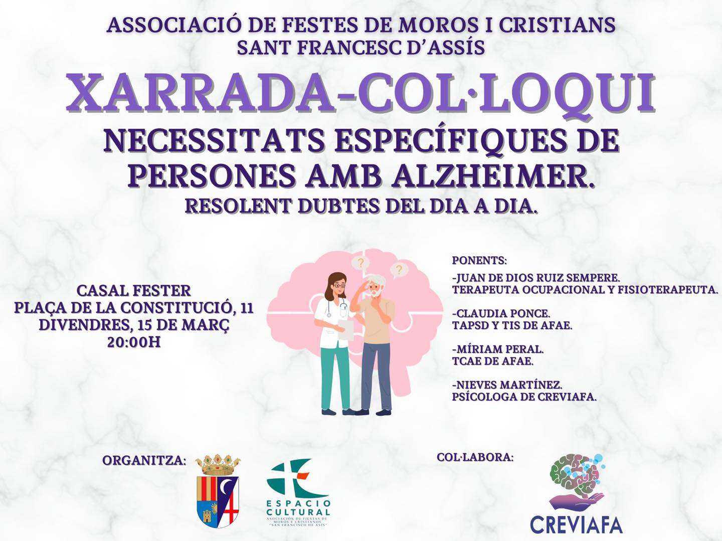 Este próximo viernes 15 de marzo a las 20.00 hrs, siguiendo con las actividades que se enmarcan dentro del Espai Cultural de la Asociación de Fiestas de Moros y Cristianos San Francisco de Asís en colaboración con Creviafa Crevillent, tendrá lugar la charla-coloquio “Necesidades específicas de personas con Alzheimer, resolviendo dudas del día a día”.