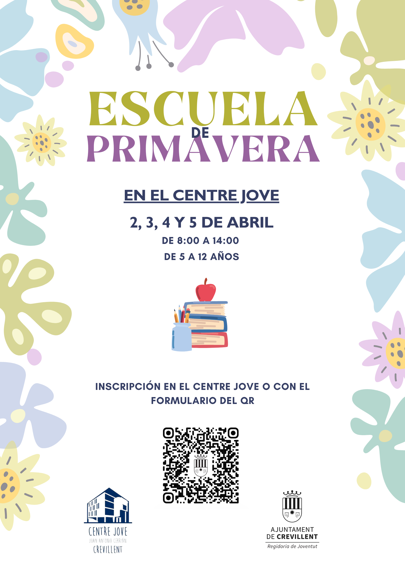 - La escuela se realizará en el Centre Jove “Juan Antonio Cebrián” los días 2, 3, 4, y 5 de abril en horario matutino de 8:00 a 14:00 horas y para poder participar se deberá tener entre 5 y 12 años con una inscripción previ