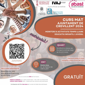 Este curs es desenvoluparà de dilluns a dijous entre el 15 d’abril i el 20 de maig en horari de 16.00 a 21.00 hores. El curs està dirigit a joves d’entre 16 i 30 anys i tots els interessats es poden inscriure presencialment en el Centre Jove o també a través del codi *QR que apareix sobreimpresionat en la cartelleria difosa a través de les xarxes socials o també en l’enllaç https://crevillent.sedipualba.es/carpetaciudadana/tramite.aspx?idtramite=13623